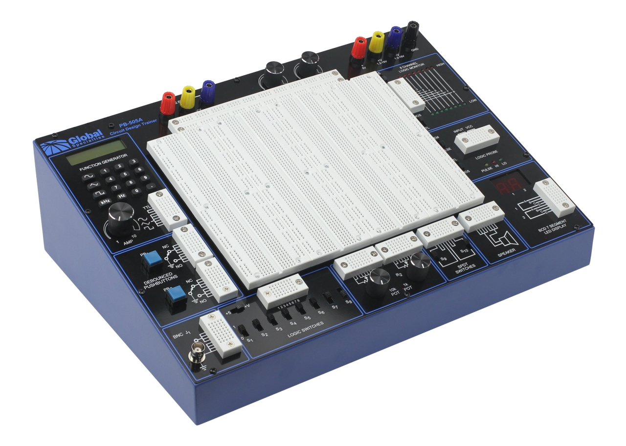 El Modelo PB-505 de Global Specialties es una Estación de Trabajo de Diseño Avanzado Analógico y Digital. Su construcción robusta hace que el entrenador sea ideal para todos los niveles de instrucción en electrónica y diseño. El área de pruebas está comprendida por una placa de pruebas sin soldar (Protoboard o Breadboard) “Premium” de Global Specialties, respaldada por una industria líder y 3 años de garantía. El PB-505 puede ser utilizado para construir desde circuitos básicos en serie o paralelos hasta circuitos complicados y multifacéticos para microcomputadoras, incorporando lo último en la tecnología industrial de hoy. El PB-505 brinda a los estudiantes una valiosa experiencia de laboratorio desarrollando sus habilidades manuales. Al aplicar las técnicas de placas de pruebas alcanzarán una sólida base de experimentación con circuitos, análisis y solución de problemas.