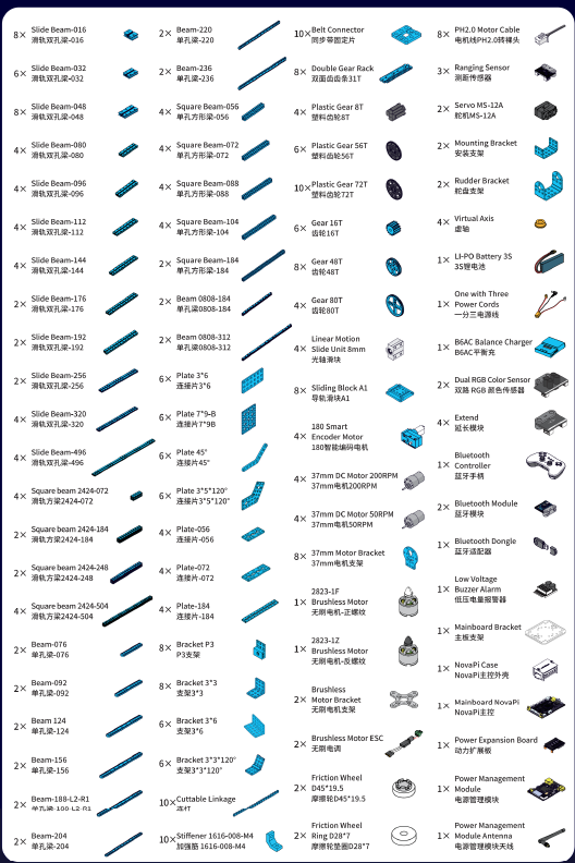 abundantes piezas electrónicas y estructurales, lo que le permite construir robots de diferentes formas y maneras.